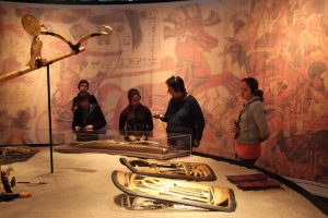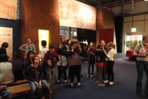 Nie hatte er aufgegeben, dieses Grab zu suchen. Nach vielen Jahren fand er endlich am 4.November 1922 den Zugang zum Grab, das er am 26. November im Beisein seines Geldgebers Lord Carnarvon öffnete. Alle Schüler verfolgten gebannt die Öffnung des Grabes auf der Leinwand. Merkwürdige Tiere, Statuen, Fahrzeuge – überall der Glanz von Gold. Auf unserem weiterenRundgang konnten wir uns die rekonstruierten Grabkämmern und die goldenen Schätze im Detail anschauen. Besonders das Grab und die berühmte Goldmaske des jungen Pharaos machten uns sprachlos. Nach über zwei Stunden konzentrierten Hörens und Staunens über die unendlichen Grabschätze machten wir vor dem Thron des Pharaos unser Klassenbild. Dann ging es wieder mit dem Zug zurück nach Alsdorf. Da alle im Museum sich sehr diszipliniert und ordentlich verhalten hatten, waren auf dem Bahnsteig die Luftsprünge durchaus erlaubt.