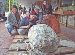 Projekt „Pillars of Freedom“ – eine Säule der Freiheit wird von Schülern der Gustav-Heinemann-Gesamtschule gestaltet. Konzentriert bearbeiten Eileen Dahmen und Michael Piontek einen Findling. Tipps gibt es dabei von Künstler Alfred Mevissen (mit Hut). Lehrerin Julia Brügge (l.) und Laura Peters sehen zu.
