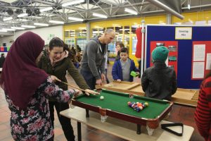 Am Stand „Gemeinsames Lernen“ standen Spiele auf dem Programm, mit denen man seine Konzentration schulen kann und kleine Billardtische ergänzten die Informationen zum umfangreichen Ganztagsangebot an der GHG. Am Stand der Fachschaft Englisch wurden die Besucher durch eine Schülerin des 9. Jahrgangs mit der sprechenden Fledermaus „Ben the Bat“ auf Englisch empfangen und direkt in ein Gespräch verwickelt. Einmal in der Fremdsprache angekommen ging es dann spielerisch mit Weihnachtsbildern als Sprechimpulsen weiter. Auch das Fach Türkisch kann an der Alsdorfer Gesamtschule im Rahmen des Wahlpflichtfaches gewählt werden. Mit anschaulichem Bildmaterial aus den 60er Jahren informierte das Fach über die Geschichte der Türkei und die Einwanderungszeit der damaligen Gastarbeiterfamilien.