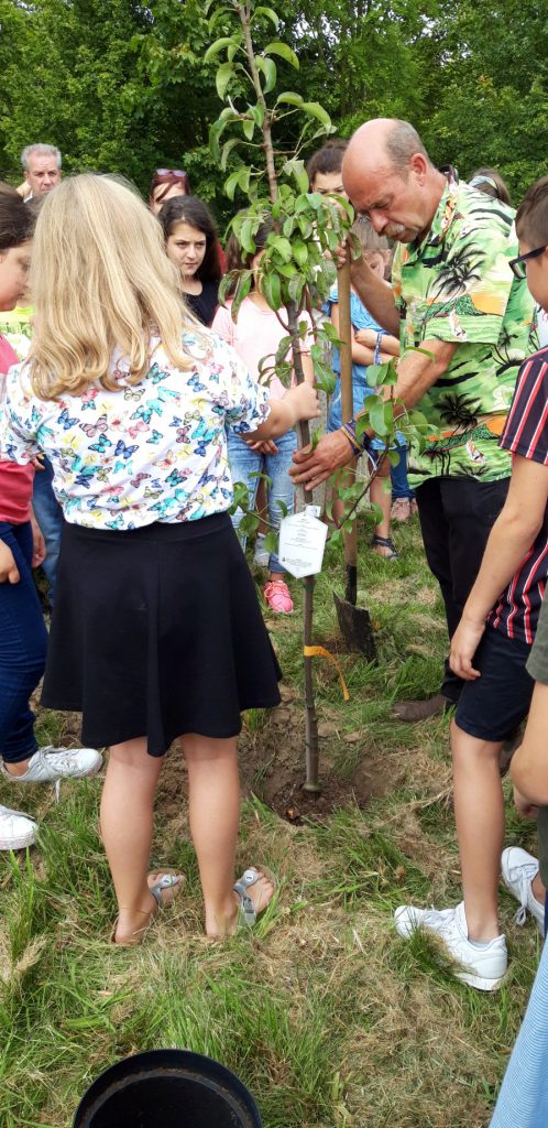 Eine weitere Premiere in der Schulgeschichte feierte der besondere Akt zum Abschluss des ersten Schultages. Mit einem jungen Birnbaum pflanzten sich die Schülerinnen und Schüler des 5. Jahrgangs in die Schulgemeinschaft, wo sie nun tiefe Wurzeln schlagen können. Der Abteilungsleiter, Herr Michael Mohr freute sich, zu diesem Anlass zahlreiche interessierte Eltern begrüßen zu können, die gespannt zusahen, wie die Kinder den Baum einpflanzten. „Der erste Schritt ist gemacht und nun kommt es auf eure Pflege an, ob ihr bald die leckeren und süßen Früchte der „Guten Luise“ ernten könnt, so wie es das Etikett verspricht“, erklärte der Abteilungsleiter.