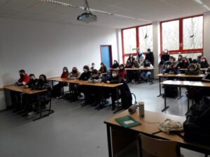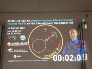 Die Klasse von Annabell und der Oberstufenkurs von Manal versammelten sich vor der Leinwand, um mit dabei zu sein, als der Countdown für den Livecall von Aachen aus gestartet werden konnte und die Schülerinnen und Schüler ihre Fragen an Matthias Maurer stellten. Dabei konnten leider durch die Coronapandemie bedingt nicht alle Fragesteller/innen live im Übertragungsraum dabei sein. Ihre Fragen wurden aber vor Ort stellvertretend vorgetragen.