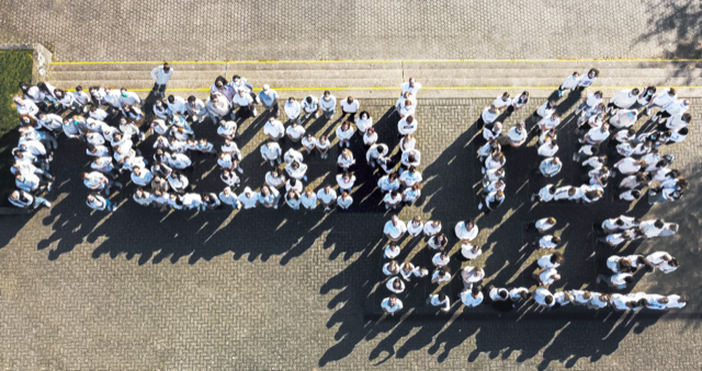 Auch den Schülerinnen und Schülern der GHG Alsdorf war es sehr wichtig, aus gegebenem aktuellen Anlass ein Zeichen für den Frieden zu setzen. Durch Organisation der Schülervertretung positionierten sich Schüler und Schülerinnen und Leherkräfte gemeinsam auf dem Schulhof und demonstrierten mit dem Schriftzug „Frieden für alle“, dass sie zu diesem Thema eng zusammenrücken und in diesem Anliegen miteinander verschmolzen sind.