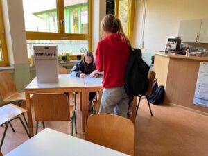 Trotz eines gefüllten Terminkalenders und laufenden Prüfungen im Abitur sowie den Zentralen Prüfungen in Klasse 10 nehmen in diesem Jahr insgesamt 15 Klassen und Kurse von der Mittel- und Oberstufe an der Wahl teil. Bereits am Mittwoch, den 4.5.2022 war es für die ersten Klassen so weit, sich mit ihrer Wahlbenachrichtigung und ihrem Ausweis im Agenda-Café der Schule einzufinden. Der Wahlvorstand, der ausschließlich aus Schüler:innen der GHG besteht, nahm die Schüler:innen in Empfang, erklärte noch einmal das Prozedere der Wahl und beobachtete genau, dass die Wahl korrekt ablief. Denn auch bei der Juniorwahl gelten die Wahlgrundsätze einer allgemeinen, unmittelbaren, freien, gleichen und geheimen Wahl.
