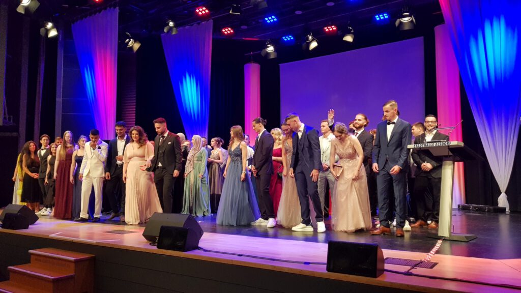 Abiturjahrgang seine Schullaufbahn an der Gustav-Heinemann-Gesamtschule Alsdorf. 75 Schüler:innen haben in diesem Jahr ihre 13-jährige Schulausbildung erfolgreich mit dem Abitur abgeschlossen und sechs Schüler:innen mit dem schulischen Teil des Fachabiturs. Der Abiturjahrgang der GHG-Alsdorf kürte seine Reifeprüfungen mit einem festlichen Abiball in der Stadthalle Alsdorf.