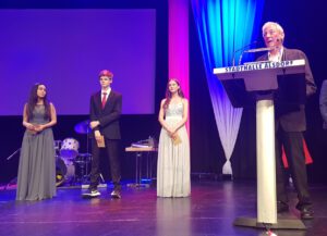 Die Beratungslehrerin Frau Sandra Heidmann-Weiß konnte krankheitsbedingt leider nicht an dem Abschied ihrer Schützlinge teilnehmen und so las der Schüler Leon Bens ihre berührende Abschiedsrede vor. „Die Schulzeit liegt nun hinter euch, doch in eurer Abizeitung, auf den tollen Fotos von unseren Ausflügen, der Berlinfahrt, in Chatverläufen und natürlich, wenn ihr euch mit euren Freunden später über witzige Anekdoten austauscht, werdet ihr euch an diese Zeit und an lustige Szenen erinnern und darüber lachen oder auch etwas traurig sein. Für mich ist das ein wichtiger Grund, warum ich Lehrerin geworden bin – Mit Energie und Spaß zu unterrichten, zu beraten, eure Energie zurück zu bekommen, immer anders, individuell, nie langweilig – ein Synergieeffekt“, lautete es in der Rede der Beratungslehrerin. „Das alles kommt nie mehr zurück, das ist aber auch nicht schlimm. Das bis hierhin hat euch geprägt, so wie ihr jetzt seid. Alles was sich für euch verändern wird, wird neu und spannend sein und ihr entscheidet, wie ihr alles Neue annehmt und mit dem, was hinter euch liegt, verknüpft. Ich beglückwünsche Euch von ganzen Herzen zu eurem bestandenen Abitur, ihr habt es geschafft. Ich sehe junge Menschen mit viel Potenzial! Und wenn es mal nicht so läuft, denkt an Einsteins Zitat! „Mit der Logik kommt ihr von A nach B, mit der Phantasie aber kommt ihr überall hin!“ Vielen Dank für die tolle Zeit mit euch“, schloss die Rede von Frau Heidmann-Weiß, die sich traurig zeigte, den würdevollen Augenblick, die stolzen Gesichter der Eltern, die strahlenden Gesichter der Absolvent:innen und die lang vorbereitete Feier nicht mit genießen zu können.