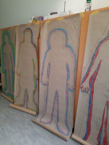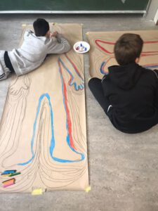 Die SchülerInnen lernen zum Beispiel ihren Körper kennen. Körpersilhouetten werden künstlerisch entdeckt. Der Umriss – als die eigene Körpergrenze nach außen- wird betont. Es gibt ebenso die Möglichkeit, Ängste, Ziele und Träume in Texten zu verarbeiten. Die SchülerInnen kommen aus sich heraus und lassen ihren Gefühlen freien Lauf. Das Herz zu Papier bringen.