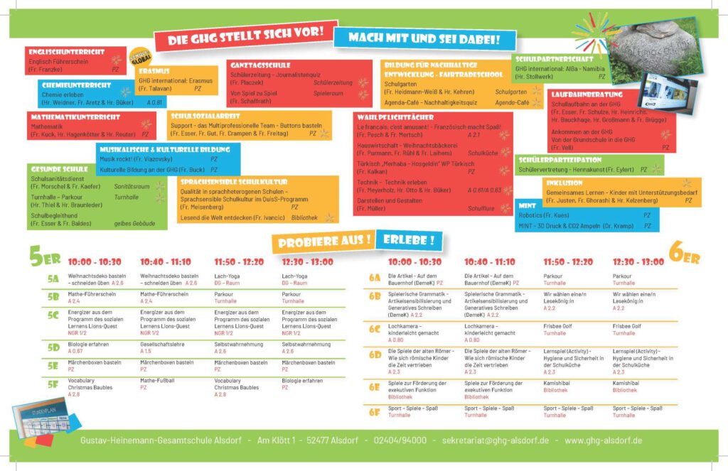 Interessierte Grundschulkinder und ihre Eltern erhalten die Gelegenheit, den Schüler:innen bei der Arbeit in Unterrichtsstunden und Projektgruppen über die Schulter zu schauen. Außerdem werden im Pädagogischen Zentrum, dem Schulgarten und in verschiedenen Fachräumen Unterrichtsergebnisse und Projekte präsentiert, die einen Einblick in das besondere Schulkonzept der Gesamtschule Alsdorf ermöglichen. Für einen ersten Überblick werden Schulführung angeboten, die im Pädagogischen Zentrum starten. So können interessierte Grundschulkinder mit ihren Eltern den Unterricht des 5. und 6. Jahrgangs besuchen und ältere Schüler:innen, die sich für die gymnasiale Oberstufe an der GHG interessieren, erhalten Informationen über die Konzeption der Sekundarstufe II und können in den Unterricht der Stufe 11 hineinschnuppern.
