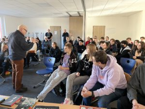 Und diesem Appell folgten die Schüler:innen sogleich: Ob die Tragödie der Familie zum Beispiel dazu geführt hat, dass er gegenüber den Deutschen oder Deutschland Hass empfinde. Welche Gefühle das Schicksal seiner Familie im Laufe seiner Recherchen bei ihm auslösten und ob er den Tätern jemals würde verzeihen können. Jede dieser Fragen beantwortete Herr Aldewerelt ehrlich und ausführlich. Die Vielzahl und das Spektrum der Fragen verdeutlichte den Anwesenden noch einmal, wie groß das Interesse der Schüler:innen an diesem Thema und der Person Jack Aldewerelt war, aber auch zugleich, wie wichtig es ist, zu diesem Thema Zugang über persönliche Schilderungen zu erhalten.
