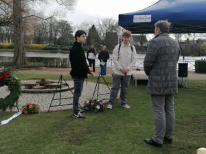 „Es ist für uns eine große Ehre, heute hier stehen zu dürfen und teilzuhaben an der Erinnerung.“, so auch sein Lehrer Tom Kolvenbach bei seinem Redebeitrag vor dem Publikum. Tatsächlich wird sowohl vom niederländischen Lehrer Erik Molnar, als auch von Herrn Jack Aldewereld immer wieder angemerkt, wie wichtig es sei, dass junge Menschen über dieses Thema aufgeklärt, aber vor allem gemeinsam, länderübergreifend erinnern können. Es sei doch etwas Besonderes, dass deutsche, niederländische, internationale junge Menschen gemeinsam an diesem Gedenkort