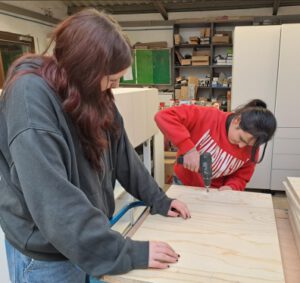 Schüler:innen von Herrn Palmen, Herrn Bäringhausen und Herrn Schulz insbesondere sehr viel praktische Hilfe. Bohren, senken, schrauben – selbst diejenigen Schüler und Schülerinnen, die zuvor noch nie einen Akku-Bohrschrauber in der Hand hielten, „tischlerten“ mit den erhaltenen Tipps und Tricks gekonnt die Schalungen für unsere Beton-Sitzwürfel.
