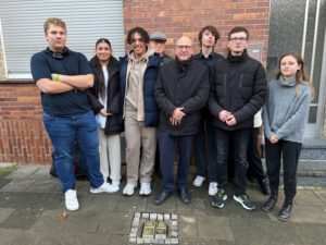 Ebenso intensiv bereiteten sich Schüler:innen der Klasse 11a mit ihrer Lehrerin Franziska Perl auf die Verlegung neuer Stolpersteine in Alsdorf vor. Gemeinsam mit Schüler:innen anderer Schulen der Region gestalteten sie die feierliche Gedenkveranstaltung u.a. mit eigenen Texten über die entsprechenden Personen, derer dort gedacht wurde, einige musizierten oder lasen eigene Gedichte vor.