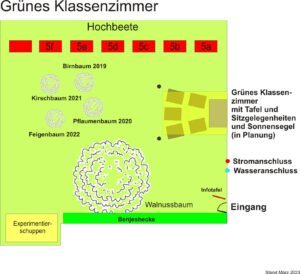Auf ein 6 x 7 m großen Areal entsteht zur Zeit ein Unterrichtsraum im Freien, der es in der wärmeren Jahreszeit erlaubt, das Unterrichtsgeschehen nach draußen zu verlegen. Eine wetterfeste Tafel sowie Strom- und Wasseranschluss schaffen optimale Rahmenbedingungen. Für die Beschattung an heißen Tagen sorgt ein Sonnensegel.