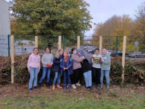 Seit dem Jahr 2022 wird sukzessive eine Totholzhecke (Benjeshecke) zum Wendehammer „An der Gesamtschule“ durch die Schulgarten AG angelegt. Diese hat für das grüne Klassenzimmer vielfältige Aufgabe. So dient sie als Sicht- und Windschutz zur Straße hin und bietet eine ideale ökologische Nische für Kleintiere, Vögel und Insekten. Gleichzeitig kann diese Hecke dauerhaft genutzt werden um Grünschnitt zu entsorgen.